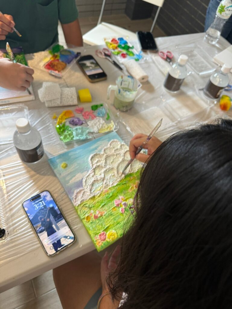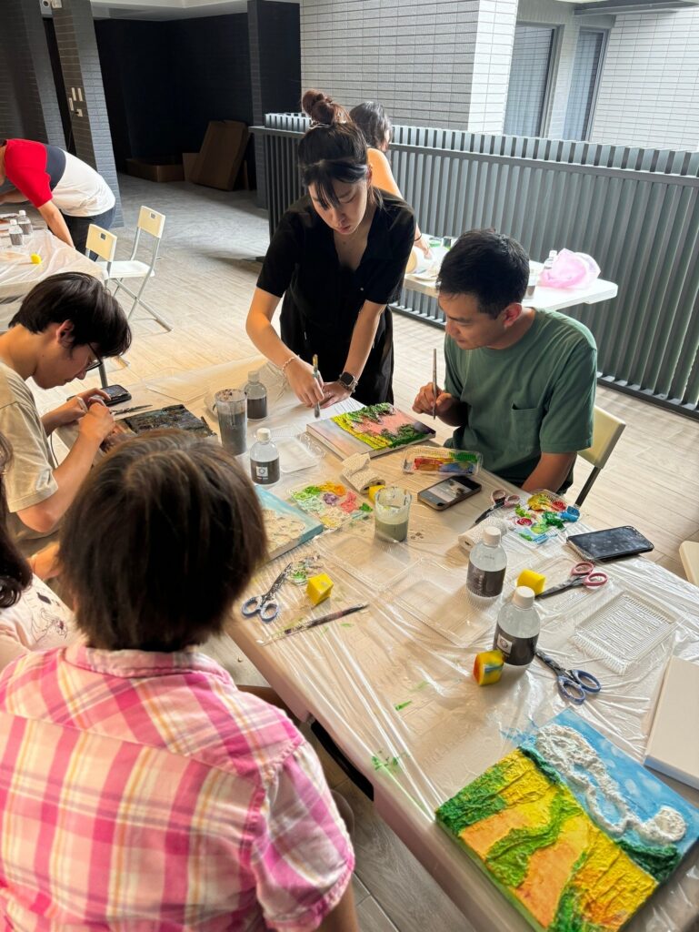 課程現場,每一張畫布前都坐著一位專注的創作者。石膏畫迷人之處在於它的「不確定性」與「層次感」,住戶們手持畫刀,在老師的技巧指導下,有人描繪山脈的起伏,有人模擬波浪的輕柔,也有人創造出充滿現代感的極簡紋理。活動過程中,大家沉浸在專注的靜謐裡,透過指尖的力度調整,每一道刮痕、每一處留白,都映照出個人對美的詮釋。這份對細節的專注與耐力,讓參與者深刻體會到:美,源自於對生活的細膩觀察與耐心的雕琢。